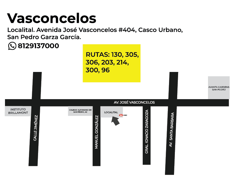 Plantel Vasconcelos Av. José Vasconcelos #404, col. Casco Urbano, San Pedro Garza García, N.L. (81) 2913 7000 Rutas que te llevan Ruta 96 Ruta 130 Ruta 203 Ruta 214 Ruta 300 Ruta 305 Ruta 306